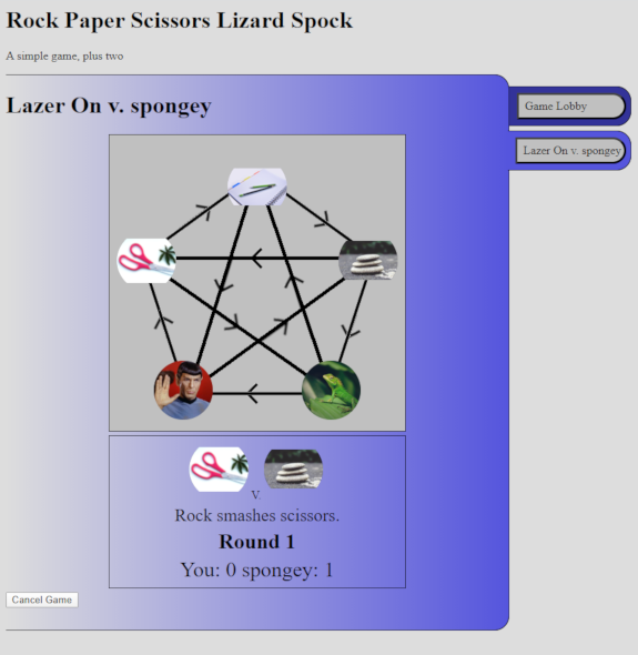 An online version of the classic rock-paper-scissors game, with two additional options- lizard and spock. Chat with other users before finding an automatic match and compete for best 3 out of 5. Register and brag about your score with your friends, or just quickly login as a guest