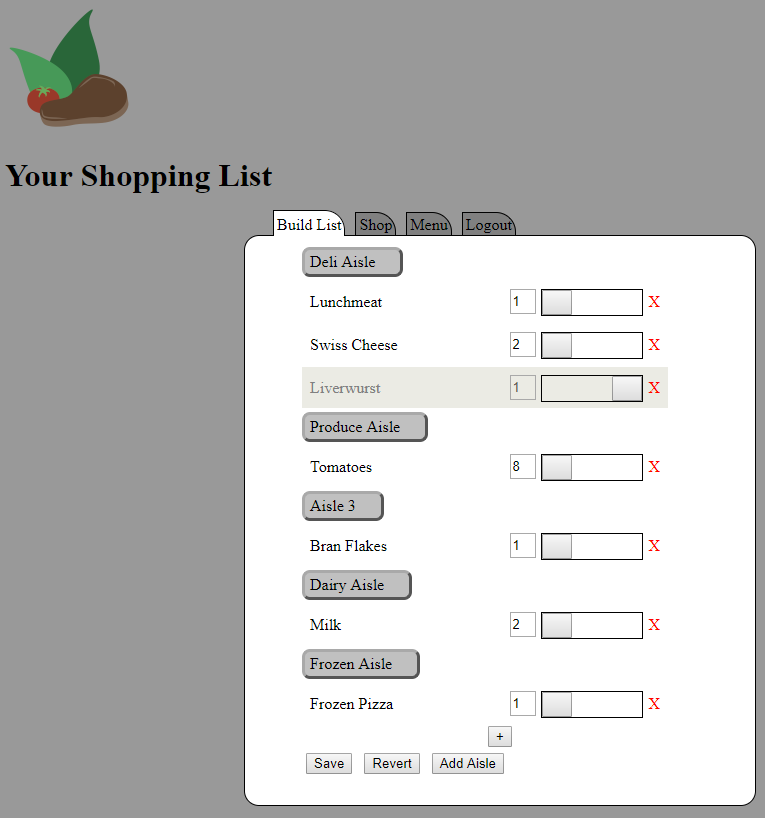 An application written using JQuery on the front end with a PHP backend. It is designed as a tool to let you store your list of commonly needed items, add new ones on need and select how many of an item you need (or leave it off entirely). A separate mode lets you mark off items as you put them in your cart. It supports reordering and rechategorizng via dragging.